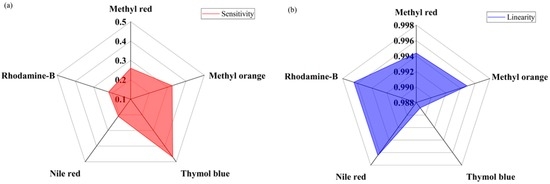 The radar chart in Figure 9a shows the sensitivities of the five optical-fiber sensing element of the proposed PWM pH-sensing systems under different pH of the buffer solution. According to the results, the proposed sensing systems offer the highest sensitivity for thymol blue containing sensing element S3, whose sensitivity is about 0.46 µs/pH. The lowest sensitivity is offered by the Nile red containing sensing element S4, with a sensitivity of about 0.21 µs/pH.