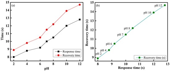 Figure 11a shows the response and recovery times of the proposed optical-fiber PWM sensing system for sensing element S1, which contains a methyl-red sensing membrane. It is observed that the response and recovery times were approximately proportional to the increase in pH of the buffer solution. This occurs because at a high pH, the active sites on the surface of the sensing element are saturated. Therefore, in a buffer solution with a high pH, the reaction on the surface gradually gained control and slowed down the response and recovery processes. The response and recovery times of the proposed optical-fiber pH-sensing system were 8 s and 9 s, respectively. The response versus recovery times of the proposed pH-sensing system are presented in Figure 11b.