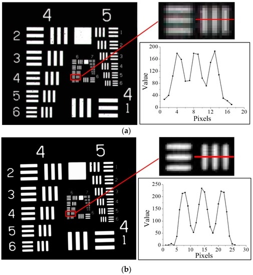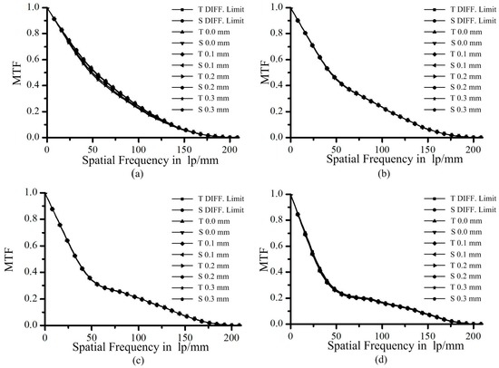 It can be seen clearly that the MTF amplitude of curve decreases in the low and middle frequencies with the increase in OR. Compared with the MTF of Figure 3a, the MTF amplitude of Figure 3c,d is lower before the point of 50 lp/mm and slightly enhanced after this point. From experience, the low amplitude of the MTF at the low and middle frequencies will result in a blurred image, while an enhanced high-frequency MTF will result in a sharper edge. Compared with the CCD being stitched here, the pixel and the microcircuit wire contrast is 0.2–0.3. Hence, the central parts of the MTF of Figure 3c,d are too weak to allow inspection of the pixels and wires. The enhancement on the high-frequency MTF is of limited contribution to the requirements here. Moreover, all the curves overlap with their diffraction limit and cut off at the same frequencies. The validity of the proposed method based on obscuration constraint can be verified by the above simulations.