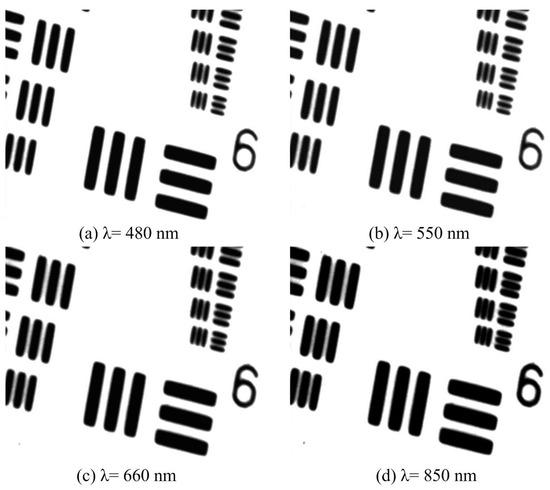 Raw image tests on the 1951 United States Air Force (USAF) resolution target with different wavelength light sources.