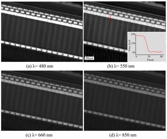 Furthermore, Figure 6 gives the inspection results on a line CCD (LC100, Thorlabs, Newton, MA, USA) with a pixel size of 14 μm × 56 μm by the developed long WD microscope with a fiber illuminator (λ = 480 nm, 550 nm, 660 nm, 850 nm). The 1951 USAF resolution target and the line CCD are not used to test the limit of resolution but to investigate the difficulty of stitching inspection due to the weak pixel contrast, the microscale of the circuit wires, and the large WD. The size of the line CCD was chosen according to the requirements of the project that the long working distance microscope objective is developed for. The image dimension is 631 × 472 Pixels. The pixels and microcircuits are both clearly identified with different wavelength light sources, as are the small node grids.