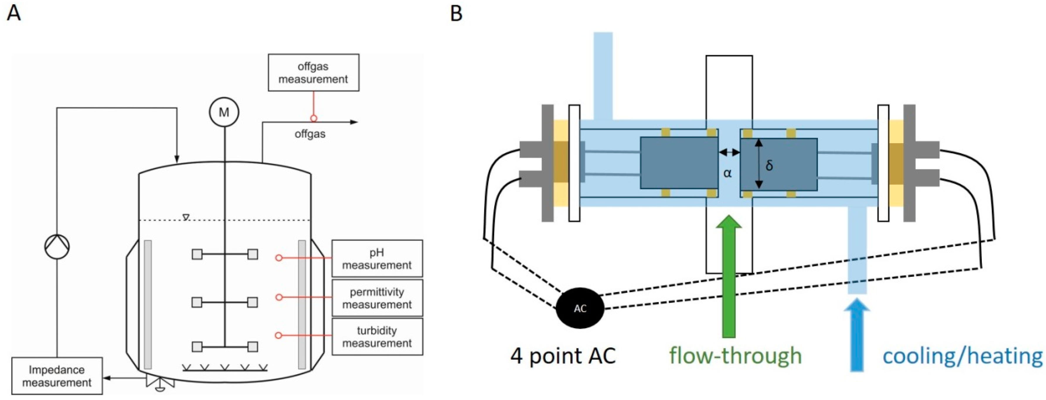 (A) Schematic drawing of the fermentation setup using the online impedance probe. A peristaltic pump establishes the flow through the probe; (B) Schematic drawing of the prototype online probe during fermentation. The stainless steel electrodes are sealed in borosilicate tubing (NW16KF) and a polymethymetacrylate mantle. An electrical connection is established using a four-point measuring method to decrease cable induction and setup interferences.