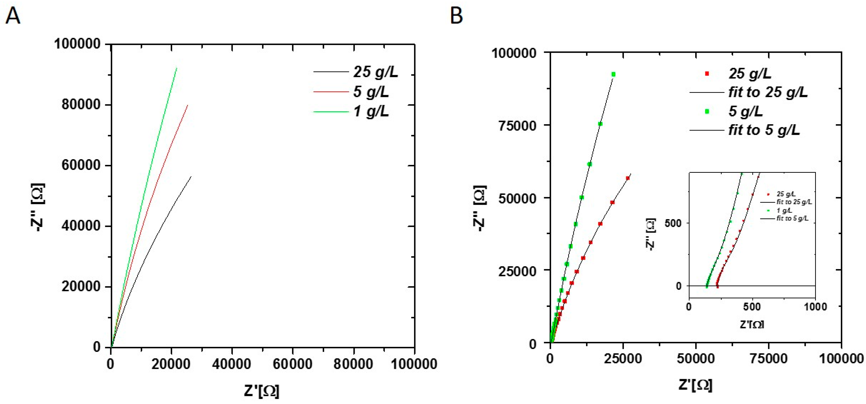 (A) Nyquist plot of E. coli samples at different concentrations (1–25 g/L) measured in offline mode. Obvious changes in the double layer are visible at low frequencies; (B) Nyquist plot of 1 g/L and 25 g/L sample with fit using equivalent circuit in Equation (1). Fitted parameters all three samples are given in Table 1. The Q value of the CPEdl element is strongly dependent on the biomass concentration.