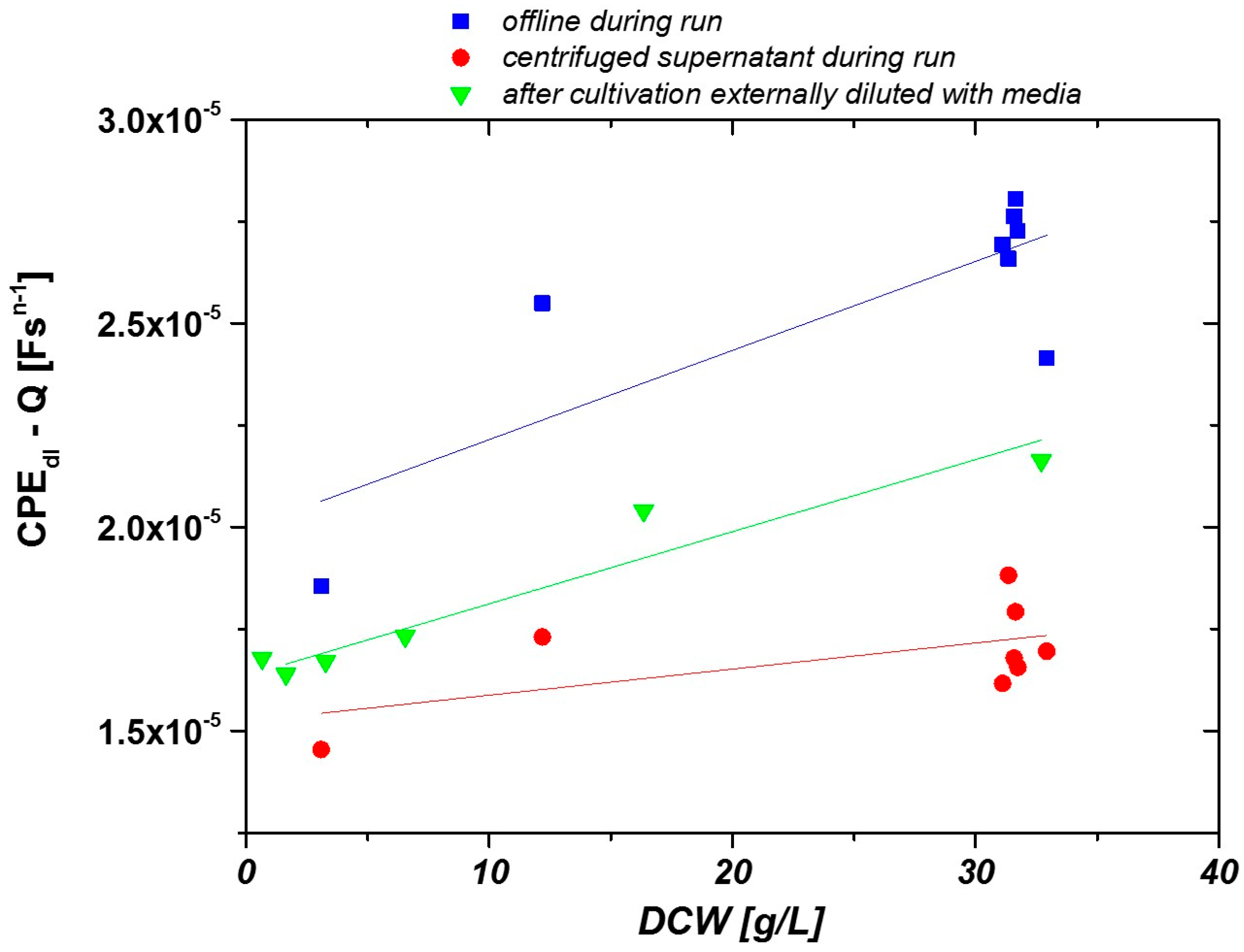 These studies were only performed at a very small scale with a low cell concentration. In general, a threshold in the measurement is present at a low cell concentration. Exceeding this limitation, very stable signals over time were achieved. Beside direct measurements in the broth, a modified electrode system in an interdigitated design can be used [28,29,30]. First approaches towards process monitoring were shown by Kim et al. [31], who worked with an inline sensor used in the lower frequency range between 40 Hz and 10 kHz for real-time monitoring of biomass. Kim et al. showed the feasibility for measuring changes in the double layer capacitance, but no analysis of the double layer capacitance (Cdl) itself was performed; only discrete extracted values for distinct frequency values were used. Furthermore, this was done only in a batch cultivation approach and no online or offline analysis of cell physiology, which is essential for differentiation between different cell states, e.g., living/dead counting, were shown. This can lead to overestimation of the measured cell density and results in additional uncertainties during the measurement.