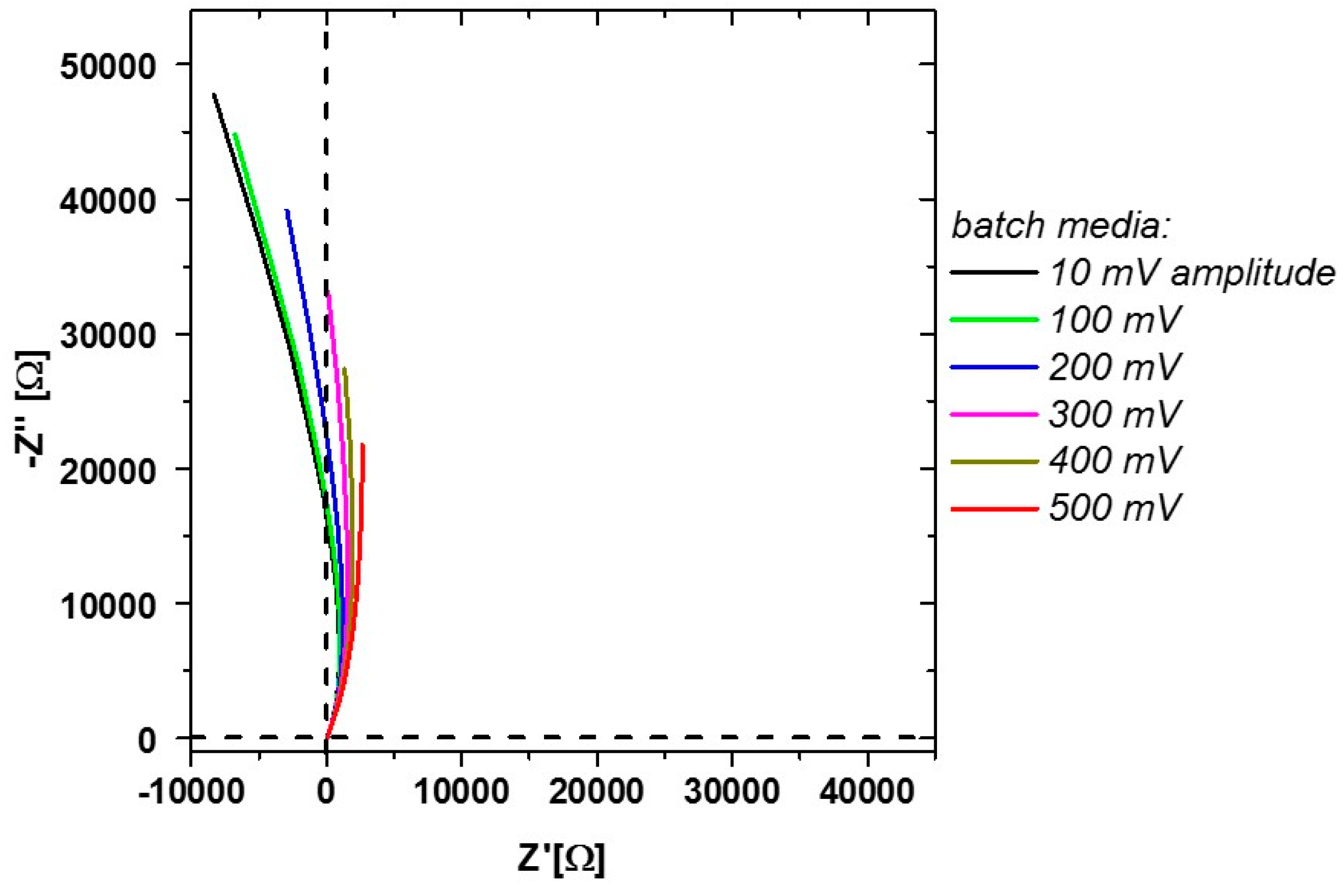 Since those impedance responses can already be spotted before inoculation, it might be related to a charge transfer reaction of media components on the electrode. An electrolyte-related change in the stability of the electrode may lead to passivation reactions. These can result in those negative differential resistances (changes of the current in respect to the applied voltage) [37]. Furthermore, negative resistances can occur during absorption/reactions on the electrode [38]. Similar impedance responses are obtained, for example for glucose, with Ni-containing electrodes [39]. Since the used stainless steel electrodes contain Ni as well, such reactions may also be possible in this case. However, since such negative resistances are not found during offline measurements of sugars, flow-through during the measurements seems to have a major effect on the spectra. Rather high amplitudes of 500 mV do not show the pronounced behavior seen at lower amplitudes and are therefore used for the later measurements in flow-through mode (Figure 4).