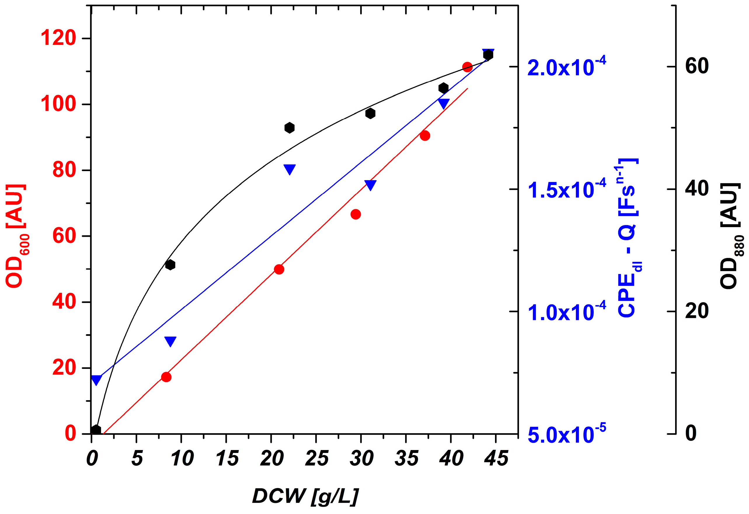 Furthermore, DCW, OD600 offline and OD880 inline were monitored. To show linearity between DCW and OD600 offline, and OD880 inline and the impedance signal, the correlation between those signals is plotted in Figure 5 using OriginLab software (OriginLab Corporation, Northampton, MA, USA). In general, media contributions are negligible with increasing electrode distance α during these measurements. Hence, values for the double layer capacitance could also be determined even with simplified fitting routines using a resistance for the real axis offset and a CPE element for the double layer capacitance when Rdl is far too high, especially in the beginning of the cultivations.