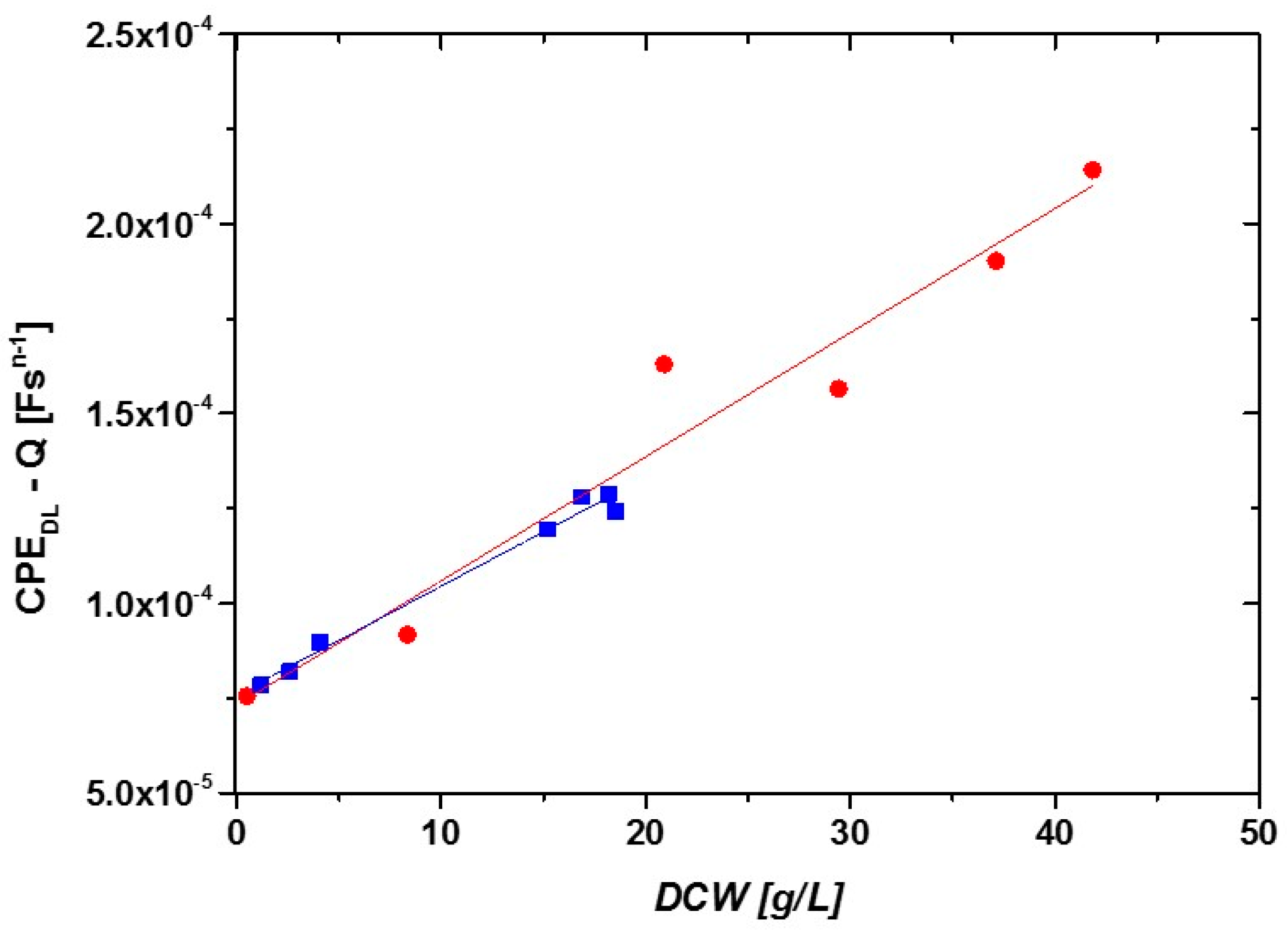 The CPE-n value is a marker for the non-ideality of the corresponding capacitance. This value can be evaluated from the experimental data and Equation (1), and is mostly in an acceptable range between 0.8 to 0.9 (vs. 1.00 for an ideal capacitance) to warrant calculation of a reasonable CDL value. Therefore, we used CPEdl-Q values instead of the calculated sample capacitance for establishing a correlation between cell concentration and impedance data to reduce the error and extend the applicability of this measurement method also to low cell concentrations, where Rdl has a high error. All fitted parameters give physically reasonable values and a low NRMSE between 0% and 10% (except for Rdl at low biomass concentrations) which indicates that the proposed model (Equation (1)) is valid. For all further analysis, CPEdl-Q was used to correlate the viable cell concentration to the impedance spectra.