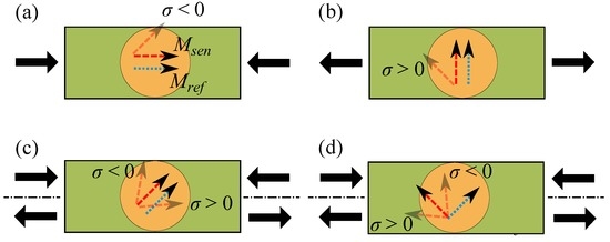 Up to now, MR-based strain sensors have been investigated in four different configurations [3,13,20] depicted in Figure 1. While the induced magnetic anisotropies or easy axes of the sense and reference layers are parallel (Figure 1a) or perpendicular (Figure 1b) to the stress axis, MR sensors only respond to compressive or tensile stress [13]. Aligning the two magnetic easy axes at 45 toward the stress axis (Figure 1c), MR sensors become sensitive to both tensile and compressive stresses [20]. Additionally, with the last configuration (Figure 1d) the type of stress, whether tensile or compressive, can be also distinguished. The inverse impact on the angle α by tensile and compressive stresses results in an increase and a decrease of the tunnel resistance, respectively. This extends the applications further to detection of both tensile and compressive uniaxial stresses by a single sensor [3]. Such configuration is achievable, for instance, by internal couplings or an external bias magnetic field.
