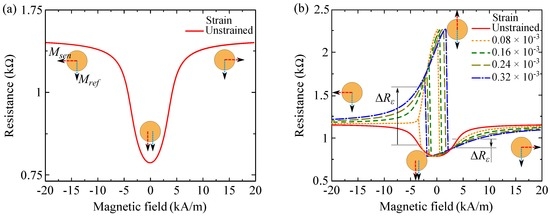 (a) Calculated loop in the unstrained state as the magnetic field is perpendicular to the induced anisotropy (); (b) Changes in the loop imposed by different levels of tensile strain. Applying tensile strain leads to changes in the resistance () at different magnetic fields.