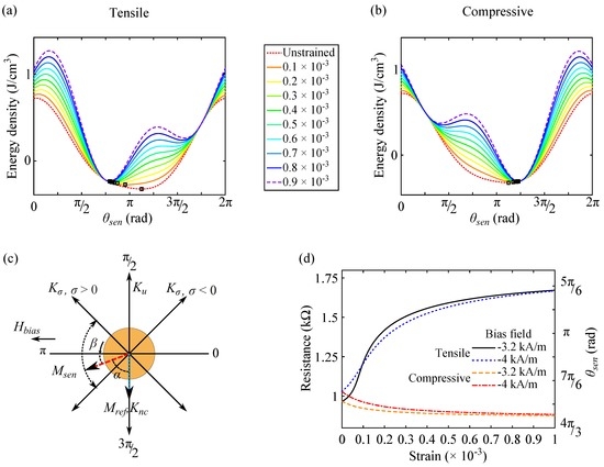 Figure 4a,b demonstrates the evolution of energy density profiles of the sense layer under tensile and compressive mechanical stresses, respectively. Following the minor loop in the unstrained state in Figure 3a, prior saturation and then gradual field reduction to a bias field with a large (Figure 3b) lead to a slight tilt β of toward caused by an interplay of the bias field and the Néel coupling (). This initial orientation of can be determined by the minimum energy point in the unstrained state, as in Figure 4c. With kA/m and J/m, β is about (). Under tensile and compressive stresses rotates toward the stress-induced anisotropy axis of and , respectively, as indicated in Figure 4c. The calculated strain loops are shown in Figure 4d.
