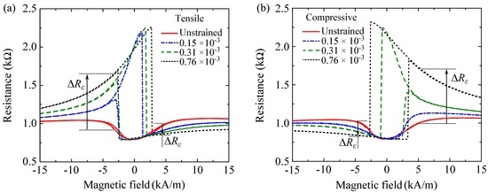 As shown in Figure 5a,b, the loop of the junction in the unstrained state changes consecutively under different strain levels. Increasing the strain further enlarges the switching fields as in the calculated loops in Figure 3b. It also reduces the asymmetry of the field loop. In contrast to the modeling results, higher strain gradually increases the highest resistance measured in the field loop, which becomes nearly (). Also, () is gradually reached within the field loop. This difference can be explained by caned magnetization and domain formation in the sense layer which are not considered in the modeling under the assumption of single-domain behavior. In comparison to tensile stress shown in Figure 5a, under compressive stress, the corresponding stress-induced anisotropy is perpendicular to the axis of the applied stress. As a result, similar but mirrored loops are observed (Figure 5b).