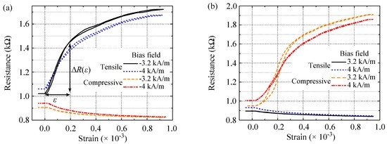Figure 6a,b demonstrates strain loops of the junction at ±3.2 kA/m (±40 Oe) and ±4 kA/m (±50 Oe) bias fields. The bias fields are chosen to be away from the switching fields at which small strain variations lead to abrupt and hysteretic magnetization and resistance changes.