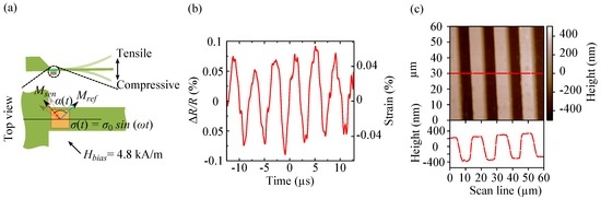 At first, the influence of mechanical stress on the loops was studied on a round TMR sensor with a diameter of m. The magnetic field was swept perpendicular to the induced anisotropy of the sense layer (), as shown in Figure 2b, while the tunnel resistance of the wire-bonded sensor was measured under 10 mV voltage by a Keithley 2400 source meter. loops were measured under 0 to strain values. The strain variation leads to different resistance changes at different magnetic fields. This allows one to figure out at which bias fields the strain variation is accompanied by the maximum resistance change. Moreover, loops were measured by continuously ramping up the strain to ∼ and recording the sensor resistance at the bias field with the maximum . From these loops, strain sensitivity of the TMR sensor was determined by measuring its gauge factors , defined by the relative change of the resistance as a function of the applied strain ().