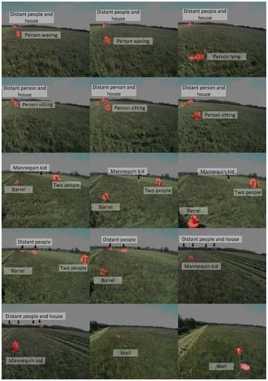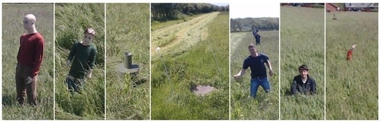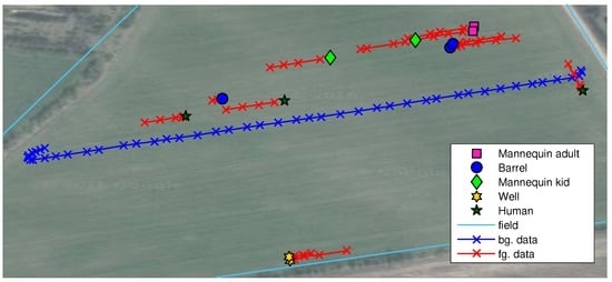 Images were recorded during a grass mowing operation in a 7.5-ha grass field near Lem, Denmark, in June 2015 on a sunny and partly cloudy day. To simulate potential obstacles humans, green barrels [], kid and adult mannequins were placed in the trajectory of the tractor. Image examples are presented in Figure 3. Two datasets are used in this work; background data for generating the background model and test data for evaluating anomaly detection configurations. The background data consist of 56 images recorded in a single crossing of the field from one end to the other. The test data are a selection of 48 images from 12 scenarios with per-pixel annotations of humans, houses, mannequins, barrels and wells. Each scenario contains 3–5 image samples taken in a range of 2–20 m to the obstacle as the tractor approaches. The obstacles and the tractor positions are estimated using GPS measurements and depicted in Figure 4. Other obstacles visible by the camera, such as humans watching the experiment, shelter belt and a house, are not depicted in the figure.