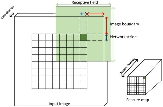 Mapping of a feature map entry (marked with dark green) back to the input image. A feature map entry describes an area of similar size as the network stride in the input image. A feature is determined by the information captured in the receptive field. Image boundary areas are not explicitly described by a feature map entry; only implicitly by the receptive field of nearby feature map entries.