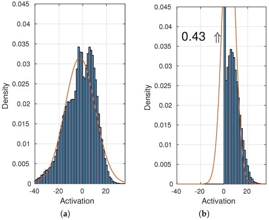 Histogram of a neural network unit before (a) and after (b) a ReLU (Rectified Linear Unit).