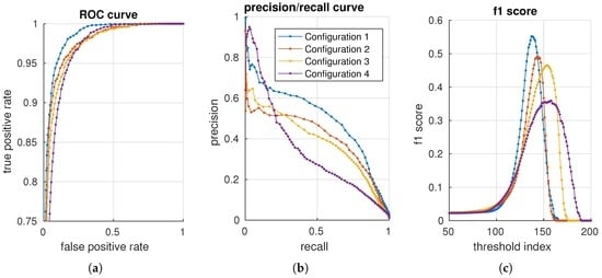 We use the background data to create a normality model for all configurations. Each configuration is evaluated against the per-pixel annotated test data. In total, 460 configurations are evaluated. For each configuration, a receiver operating characteristic (ROC) [] curve, precision/recall (PR) [] curve and the f1 score [] are generated with 200 distributed thresholds. Four configurations are presented in Figure 11 using, respectively, an ROC, precision/recall and an f1 score curve. The advantage of precision/recall and the f1 score is that true negatives are not included in the metric. As the data mostly contain negative samples (field samples), the (zoomed) ROC plot shows curves that are squeezed together.