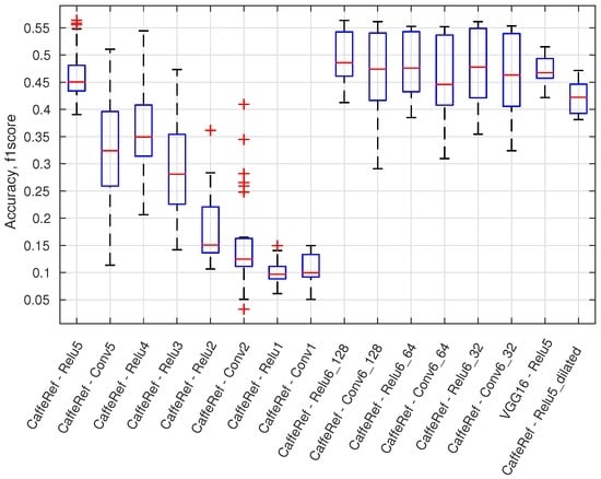This sections provides an overview of the 460 configurations by using the maximum f1 score and boxplot presentations. In Figure 12, a boxplot presents the accuracy variation (maximum f1 score) for all configurations using a specific output layer. There are, e.g., 56 different configurations for the CaffeRef—Relu5 output layer. Generally, the accuracy degrades for lower feature layers; dilated layers are not preferable, and ReLU layers are mostly preferred over convolutional (Conv) layers. Generally, feature compression using 1 × 1 convolutional layers (Relu6_X and Conv6_X) does not significantly reduce performance. Compression of features will reduce the processing time for an anomaly module and will for some classifiers also improve accuracy.
