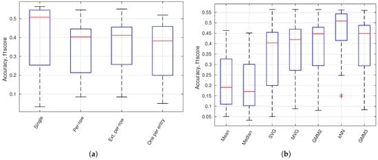 In Figure 13a, a boxplot presents the accuracy variation for all configurations using a specific image model geometry. It shows that a single model or the model per-row performance is better than the traditional background subtraction geometry with one model per entry. In Figure 13b, a boxplot presents the accuracy variation for all configurations using a specific normality model type. GMM 2 and GMM 3 is a GMM model with respectively 2 () and 3 () Gaussian models. The kNN-based model is of highest performance followed by the Gaussian-based models. Mean and median models are inferior to other model types.