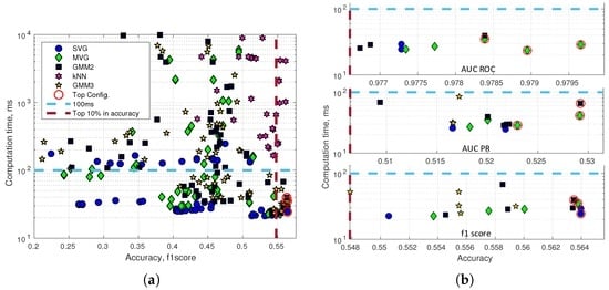Accuracy and computation time. (a) Accuracy is measured using the f1 score; (b) top configurations rectangle of AUC_ROC, AUC_PR and the max f1 score.