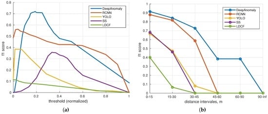Accuracy performance (f1 score) of DeepAnomaly and four state-of-the-art object detection algorithms. (a) Accuracy relative to thresholds; (b) accuracy relative to distance intervals.