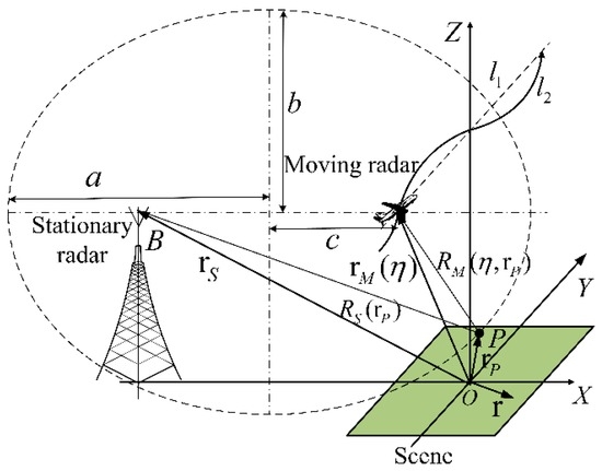 The DTDA (i.e., the BPA) can be considered as a direct transformation process from the radar echoes into a complex SAR image, and therefore it can be applied directly for the OS-BFSAR imaging processing without any modification. Unlike the monostatic DTDA, the backprojection (BP) of the radar echoes in the bistatic DTDA for the OS-BFSAR imaging processing is carried out over an ellipsoidal basis. In Figure 1, a and b are the major and minor axes of the dashed ellipse, whose foci are determined by the positions of the considered moving and stationary radars. Based on the major and minor axes (a and b), the linear eccentricity can be defined as . r = (x,y,0) is assumed to be an arbitrary sample in the scene, and then the value of the SAR image at the sample r calculated by the bistatic DTDA is given by [32]: