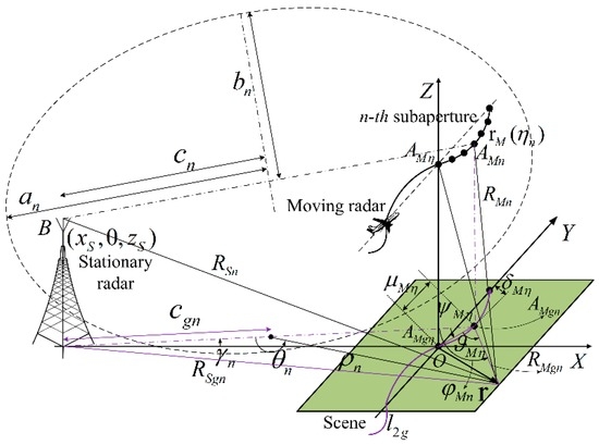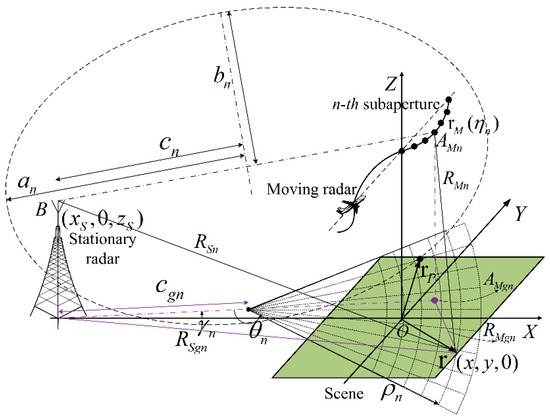 From the imaging geometry in Figure 3, the bistatic distance from the moving and stationary radars to the sample (ρn,θn) at the slow time η can be computed and expanded using the Taylor series, which is given by: