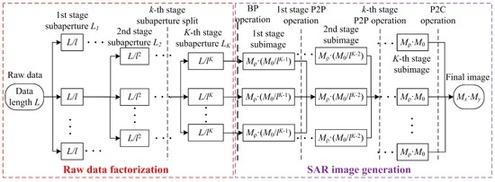 Similarly, the proposed ETDA improves the imaging efficiency by dividing the full synthetic aperture of the moving radar with L aperture positions. In other words, the full synthetic aperture is split recursively K times or stages by a factor of Fk in the k-th (1 ≤ k ≤ K) stage, and until subapertures of the size are finally reached. Then, we have: