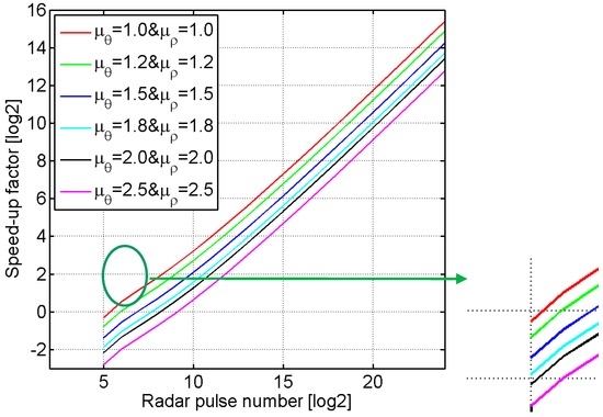 The value of the speed-up factor κEDTA is determined by factors L, l, K, μθ and μρ, and the values of factors μθ and μρ are both larger than or equal to one in general. When the radar pulse number L (i.e., the length of the synthetic aperture of the moving radar) increases, only the factor K in Equation (55) increases in K = logl(L/LK), where the factors l, μθ and μρ are assumed to be the constant values. Figure 6 shows the logarithm (base 2) of the speed-up factor with respect to the radar pulse number L for the different values of factors μθ and μρ, where LK = 16 and l = 4 are assumed. From Figure 6, it is clearly found that the logarithm values of these speed-up factors marked by different colors are almost directly proportional to log2L in some range.