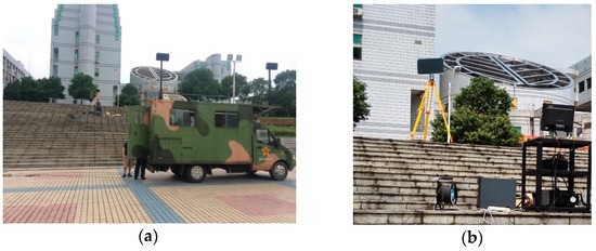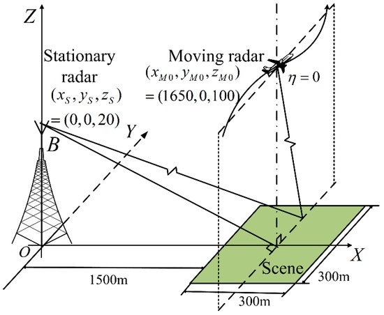 Bistatic forward-looking SAR (BFSAR) [7] is a special bistatic SAR (BSAR) system [8,9], where the radar system works in the forward-looking mode compared with the traditional BSAR system working in the side-looking mode. It not only inherits the advantages of the BSAR system, such as reduced vulnerability for military applications, exploiting the additional information and improving the detectability of the stealth targets, but also carries out high resolution scene imaging in the forward direction [10], and therefore it has gained wide attention in missile navigation, war-field reconnaissance, and forward-looking imaging. Recently, several countries have carried out the experiments on BFSAR imaging processing, and some excellent results were obtained, such as the BFSAR experiment with a fixed ground-based receiver working in the forward-looking mode [11,12], the BFSAR experiment with a vehicle-based transmitter and a receiver on board an ultra-light aircraft [13,14,15], and the BFSAR experiment using the TerraSAR-X as the transmitter and the airborne phased array multifunctional imaging radar (PAMIR) as the receiver [16,17]. One-stationary BFSAR (OS-BFSAR) is regarded as a SAR system combining the one-stationary BSAR (OS-BSAR) and BFSAR systems, which has a stationary radar (transmitter or receiver) fixed on the top of a high tower or mountain and a moving radar (receiver or transmitter) placed at a vehicle/airborne/spaceborne platform. The OS-BFSAR system not only inherits the advantages of the OS-BSAR and BFSAR systems, but also is subject to the difficulties of the imaging processing due to its special configuration, i.e., the huge amount of echo data, large spatial-variance, serious range-azimuth coupling and complicated motion errors. These make the precise imaging processing of the OS-BFSAR data more complicated.