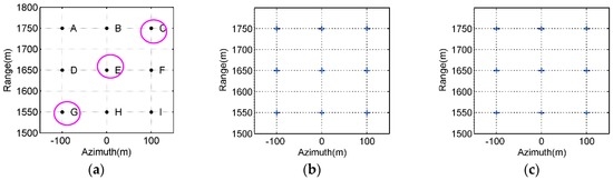 where, is the q-th polar subimage in the k-th stage, and is the p-th polar subimage at the (k − 1)-th stage. ( is the corresponding position of the polar grid ( in the polar subimage . However, in the practice terms, the position ( may not be just a discrete sample position in the polar subimage . According to [40,41], the values of the position ( in the polar subimages should be interpolated from that of its surrounding samples in polar subimages by the different interpolation methods [50]. Please note that, before the interpolation is operated, the upsampling of the data of the polar subimages in the polar range and polar angle is usually required in the proposed ETDA, since it will directly affect the final SAR image quality [50].