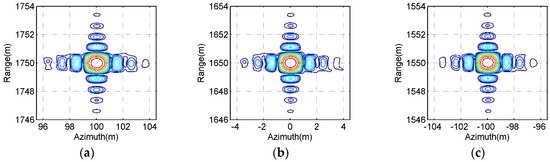 According to [46], if the sampling requirements for the polar grids are satisfied for all processing stages, it is found that the grid interpolation is the main source of error in the proposed ETDA, and is also the computational bottleneck of the proposed algorithm. It is well known that the quality of the SAR image is a trade-off between the imaging precision and efficiency. Fortunately, the high precision interpolators used in the ETDA can be easy to obtain in [50]. The two dimensional linear interpolations are used in the proposed ETDA due to their high efficiency. The low-pass linear interpolation is used in the polar angle since the angular signal is low-pass, and the band-pass linear interpolation is used in the polar range since the transmitted signal is band-pass [46]. Of course, there are also other interpolation methods. For example, the cubic spline interpolation can be used in the polar angle and the fast Fourier transform (FFT) and inverse FFT (IFFT) in combination with the zero padding can be used in the polar range, which is another alternative.