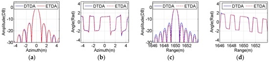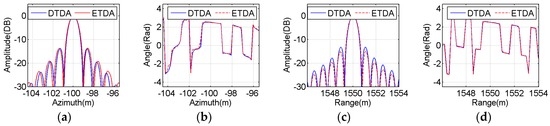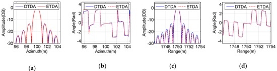 In order to quantitatively evaluate the focusing quality of the SAR images in Figure 18, the resolutions of the focused trihedral reflector in the X and Y axes directions are measured based on the width of the amplitude profiles at −3 dB point. The measured resolutions in the X and Y axes direction obtained by the bistatic DTDA are 0.35 m and 1.73 m, respectively. And, the measured resolutions in the X and Y axes direction obtained by the proposed ETDA are 0.37 m and 1.87 m, respectively. Therefore, the measured resolutions by the two algorithms are very similar, which indirectly proves the validity of the proposed ETDA. Finally, for the sake of brevity, only the reconstruction time of the scene by the two algorithms is measured. The reconstruction time of the scene using the bistatic DTDA is 4687 s, while the scene reconstruction time using the proposed ETDA is 386 s. It can be concluded that the proposed ETDA is much faster than the bistatic DTDA while the achieved accuracies are about the same for the real OS-BFSAR imaging processing.