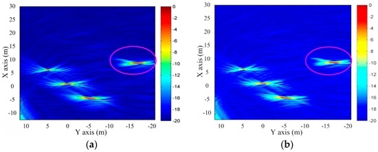 Imaging results of the measured data obtained by the different algorithms. (a) Bistatic DTAD; (b) Proposed ETDA.