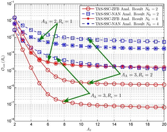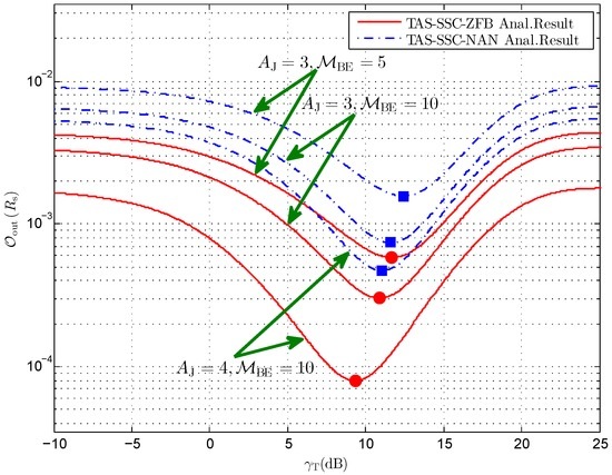 In the following, by substituting Equations (9) and (10) into Equation (18) and using [44] (Equations (1.111), (3.381.3), and (9.211.4)), the secrecy outage probability in Equation (18) is derived in Equation (19) for the TAS-SSC-ZFB scheme. Similarly, for the TAS-SSC-NAN scheme, is presented in Equation (20). ☐