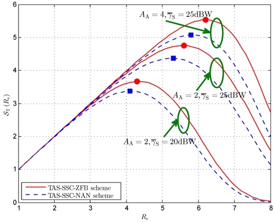 From Equation (21), it is found that the effective secrecy throughput can be characterized as the product of the secure transmission probability and secrecy rate , which evaluates the average rate of the messages that are transmitted from the BS to the legitimate user confidentially in the passive wiretapping scenario [14,15]. We now present the effective secrecy throughput in the following theorem.