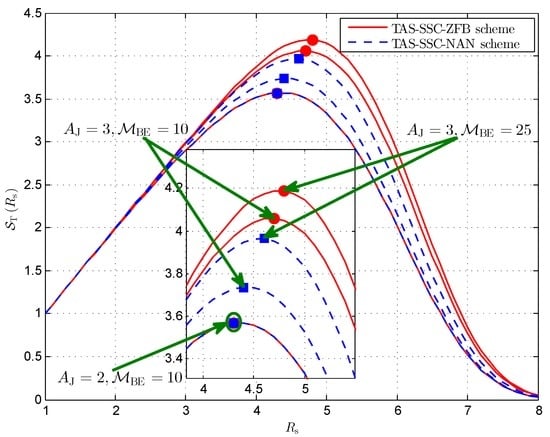 We now focus on the impact of the number of antenna elements at the jammer or the average SNR of legitimate channel . As can be obviously revealed from Figure 7, decreasing or increasing results in a reduction in the effective secrecy throughput. Moreover, we find that shifts to the left when decreases or increases. Considering the cases and , it can be seen that reducing from 3 to 2 decreases from 4.4 to 4.3 for the TAS-SSC-NAN scheme and from 4.7 to 4.3 for the TAS-SSC-ZFB scheme. Similarly, comparing the cases of and the case of , it can be found that increasing from to decreases from 4.6 to 4.4 for the TAS-SSC-NAN scheme and from 4.8 to 4.7 for the TAS-SSC-ZFB scheme. These observations indicate that the BS supports a lower secrecy rate for higher and smaller .