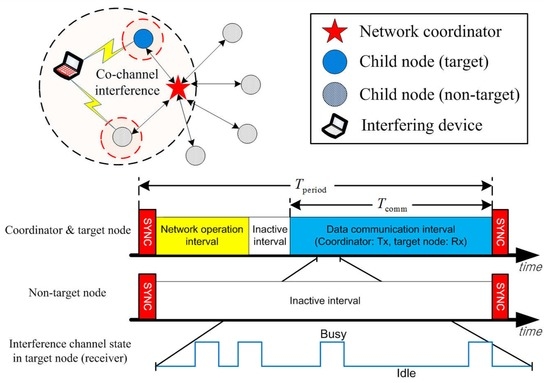 As illustrated in Figure 2, we consider a star-topology WSN comprising a network coordinator and its child nodes located in an operation range of WLANs. The WSN employs a periodic frame structure for synchronous network operation and data communications, where the period of the frame and the length of the data communication interval are T period and T comm , respectively. The network coordinator transmits a beacon at the beginning of each frame for synchronized network operation. It allocates communication resources to a target node using a handshaking protocol during the network operation interval [35]. Non-target nodes may stay in sleep mode to minimize power consumption.