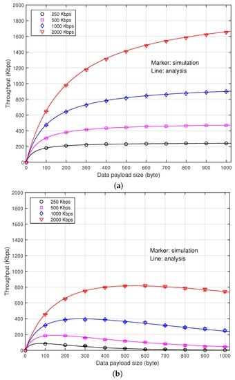 Figure 4. Throughput according to the payload size. (a) When ρ = 0; (b) When ρ = 0.2.