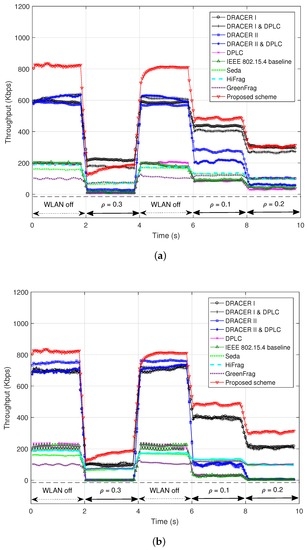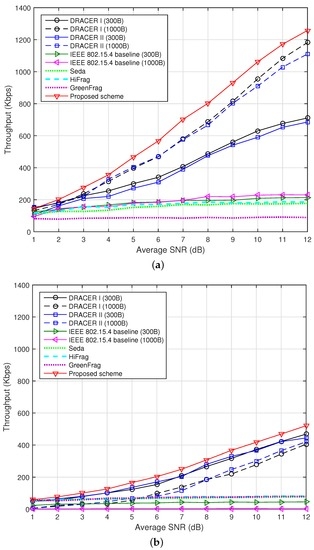 Figure 7. Throughput according to the change of interference. (a) When L = 300 bytes; (b) When L = 1000 bytes.