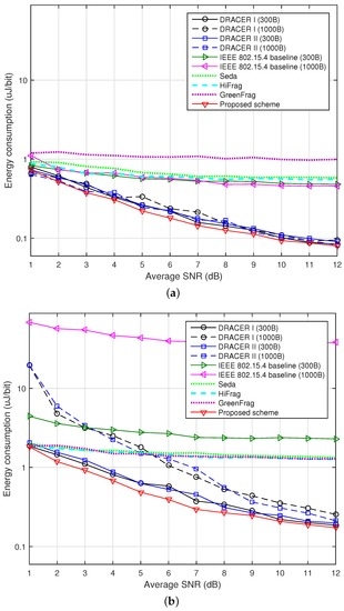 Figure 9. Energy consumption according to the SNR. (a) When ρ = 0; (b) When ρ = 0.2.