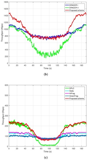 Figure 10. Transmission performance in the presence of mobile interference source. (a) Simulation scenario (without any shadowing); (b) Throughput according to time when the maximum R is 2 Mbps; (c) Throughput according to time when the maximum R is limited to 250 Kbps.