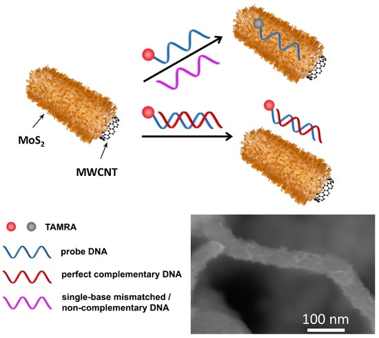 - Huang, K.J.; Liu, Y.J.; Wang, H.B.; Wang, Y.Y.; Liu, Y.M. Sub-femtomolar DNA detection based on layered molybdenum disulfide/multi-walled carbon nanotube composites, au nanoparticle and enzyme multiple signal amplification. Biosens. Bioelectron. 2014, 55, 195–202. [Google Scholar] [CrossRef] [PubMed]