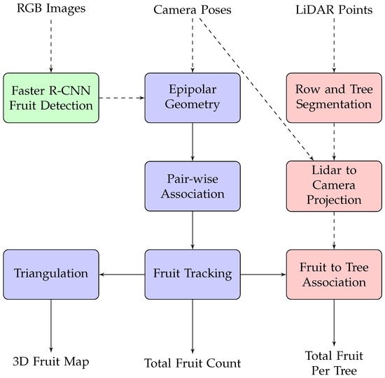 Flow chart of the proposed algorithmic pipeline. Fruit is detected within each RGB image using faster R-CNN. This is the only step that uses the image data (shown in green). Using the camera poses provided by the navigation system, the the fruit is associated and tracked through sequences of multiple images from multiple viewpoints and triangulated to locate in 3D, using a sequence of geometric operations (blue). LiDAR data (red) are used to associate the fruit with the corresponding tree.
