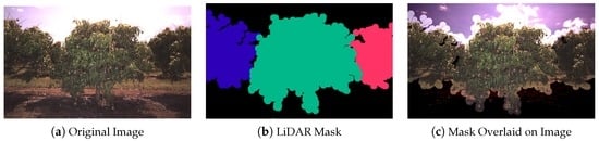 Image masks were then created from the LiDAR data to specify which pixels within each image belong to which tree. The process was adapted from the masking method performed for almond trees [7] to cater to multiple trees per image as required by the multi-view application. For each image, all of the non-voxelised, non-thinned, LiDAR points corresponding to all trees contained in that image were projected to the image [36]. To preserve the effect of occlusion from the perspective of the camera (which differs from the perspective of the LiDAR), the points nearest to the camera (within a 20 pixel lateral radius) were prioritised in the mask. These points were then dilated one tree at a time by the same pixel radius and layered into the mask in order of furthest to nearest tree. An example of a LiDAR-generated image mask is shown in Figure 4.