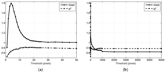 For very low threshold values (<15), fruit tracking is effected in two competing ways: (1) fruit is only counted if it is associated in at least one pair of images; therefore, low thresholds can increase the number of fruits that is missed completely, driving the count down; (2) when a track is established, low thresholds increase the probability that the track will terminate in subsequent images and then re-initialise, which drives the count up. For low thresholds, these competing forces caused instability in the slope and a lower value, as seen in Figure 6. For threshold values above 15, both the slope and reached a stable plateau near the optimal value of one for both measures. The graph shows that the algorithm is not sensitive to the tuned parameter value, as long as it is above the noise-floor of the system. The noise floor depends on a number of factors, including the accuracy of the navigation data, the velocity and rotation rates of the platform, the accuracy of time synchronisation between the navigation and camera data, the distance to the fruit and the resulting size and separation of the fruit in pixels. A reasonable estimate for this system is between four and 12 pixels from Section 3.2.