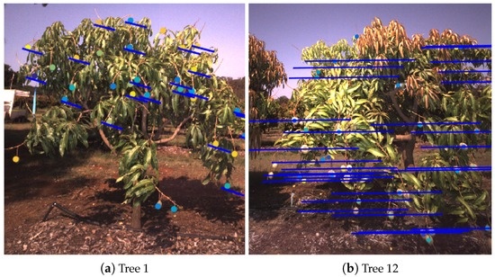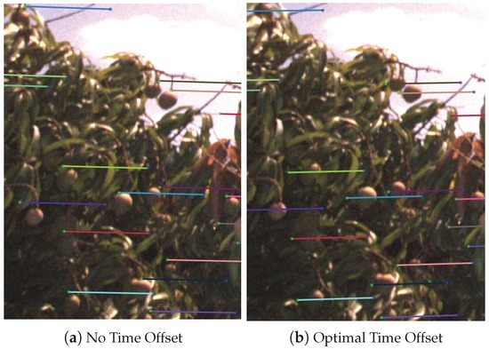 For Trees 12 and 60, during the repeat that produced the lower fruit count, the image sequences were missing in approximately half the images due to a logging error. This correctly resulted in much longer epipolar lines, as shown for Tree 12 in Figure 19b. The longer epipolar lines are geometrically correct, because the vehicle travelled further than normal between frames, but this resulted in too much ambiguity to accurately match and track all of the fruits in this case. Both error sources have already been corrected for our future experiments. The fault that caused missing frames was corrected by updating to the vendor’s latest application program interface (API). The navigation and camera system are now synchronised to sub-millisecond precision using the Network Time Protocol (NTP) with a pulse-per-second (PPS) between the GPS and computer and the Precision Time Protocol (PTP) between the computer and camera. This avoids the need to optimise the time-offset (as in Section 3.2), but that method is still required where hardware time synchronisation is not possible.