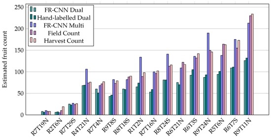 Fruit counts were estimated for every individual tree in the orchard block using the multi-view algorithm from Section 2. The counts corresponding to the 16 target trees were extracted automatically by row and tree number for comparison to the ground-truth field and harvest counts. The correct correspondence was manually verified by confirming the presence in the images of a blue tag that was tied around the target-tree trunks in the field. Additionally, the mangoes detected in the two single images from the opposite sides of each target tree, within the LiDAR mask, were summed. This was done using both the hand-labelled images and FR-CNN detections, to compare the single, dual and multi-view approaches. The estimated fruit counts from the dual and multi-view methods are shown in Figure 9, together with field and harvest counts.