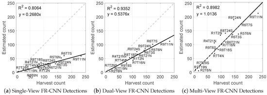 Linear models for the estimated number of fruits per tree compared to the harvest fruit count for: (a) single views of each tree (from the east); (b) dual opposing views; and (c) the proposed multi-view method. The line of equality is marked in grey.