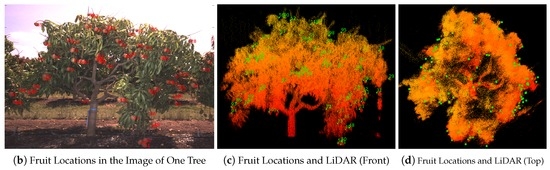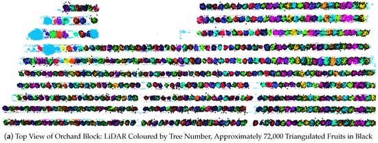 The correctness of the triangulated 3D fruit locations was assessed in two ways. Firstly, all fruits within a subset of four target trees were hand labelled for the entire multi-view sequences of images. Triangulation was performed using both the hand-labelled and FR-CNN detections and compared to assess the sensitivity of the positions to the detection method. For each fruit that was detected with FR-CNN, the nearest hand-labelled neighbour was found (in terms of the 3D Euclidean distance). For all fruit on the four trees, the mean nearest neighbour distance was 0.11 m, and the 95th percentile was 0.36 m. Secondly, the triangulated positions of all fruit in the orchard block (detected using FR-CNN) were georeferenced and viewed together with the LiDAR data, as seen in Figure 13. Qualitatively, good agreement was observed for all trees in the orchard block and at the scale of a typical individual tree.